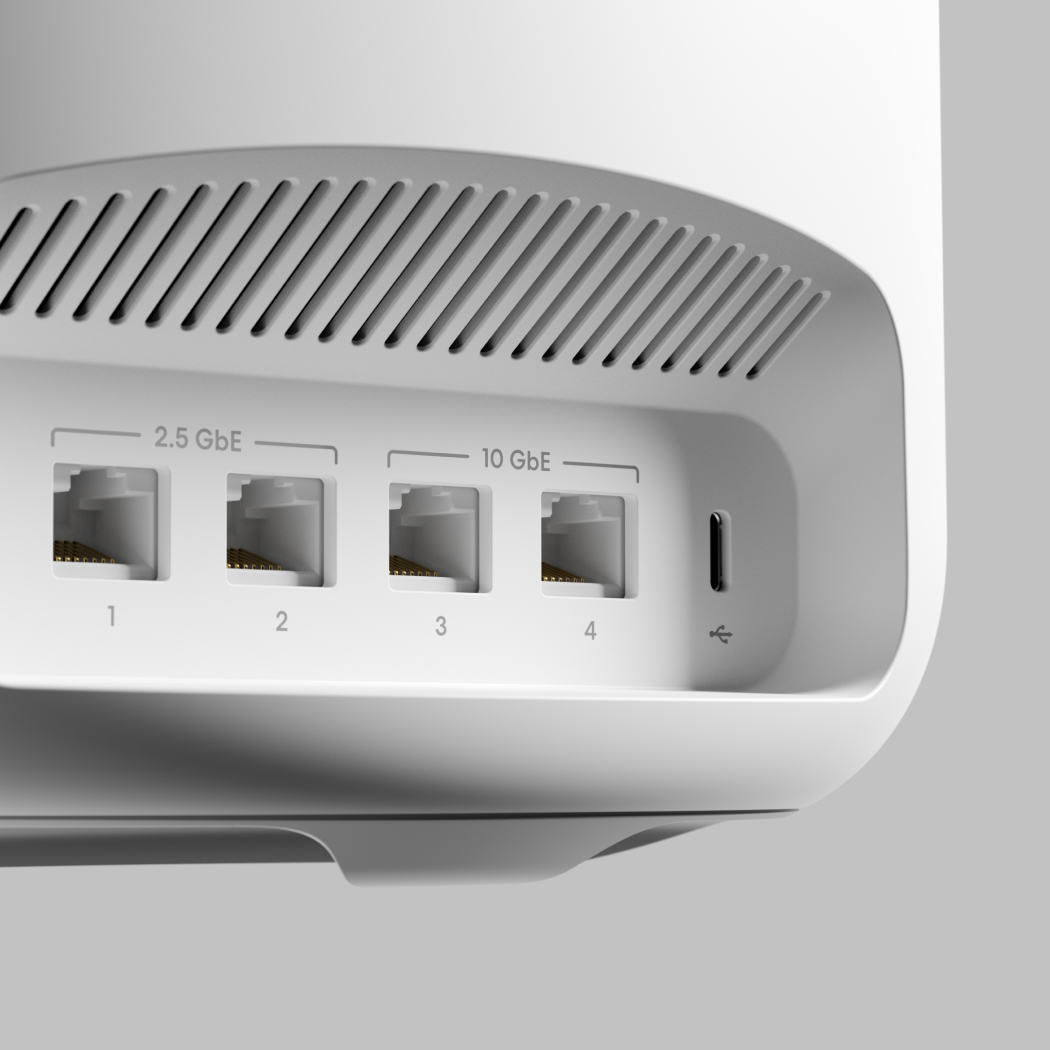 The speed of eero Max 7. With two 10 GbE ports, you can enjoy wired speeds up to 9.4 Gbps, wireless speeds up to 4.3 Gbps, and multi-gigabit backhaul speeds—making your network seriously fast.